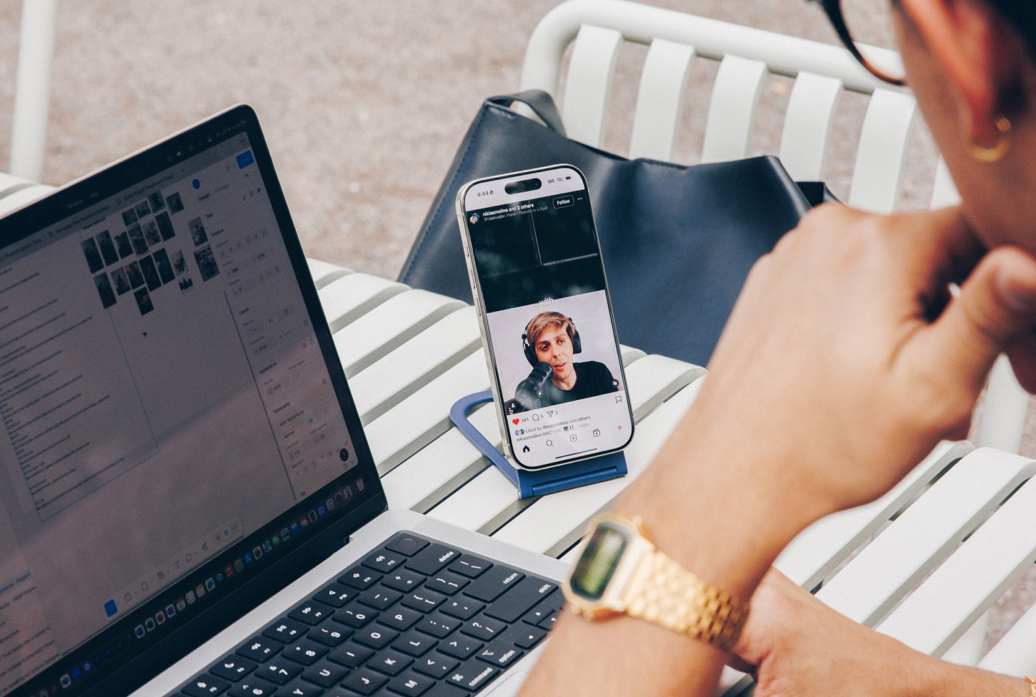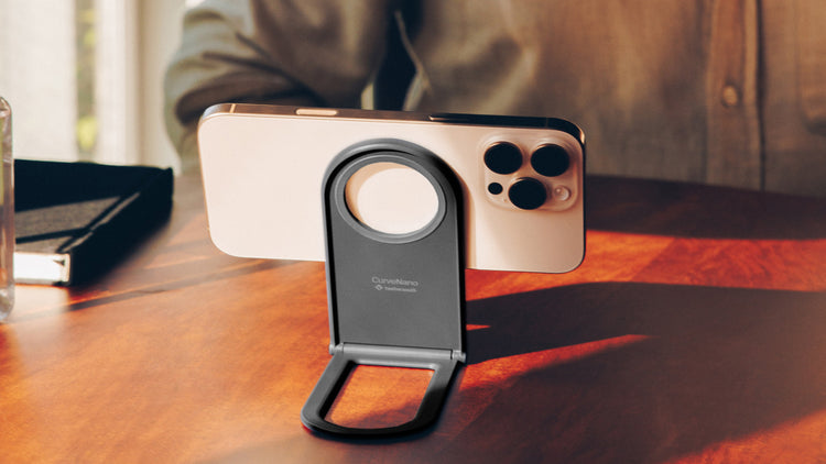 Curve Nano is a compact, magnetic iPhone stand that folds flat for travel. It holds your phone securely in portrait or landscape, perfect for FaceTime, streaming, and working hands-free on the go.